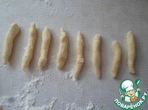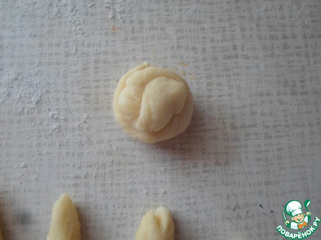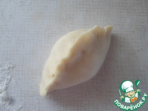 • Расстоявшееся тесто обминаем. Отрываем от него не большой кусок.