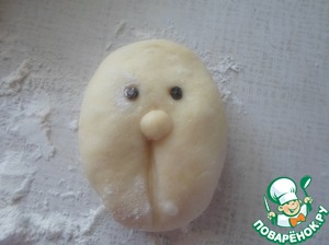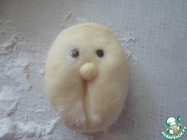 • Переворачиваем, формируем овальчик, из перца горошком делаем глаза, тупой стороной ножа, продавливаем тесто.