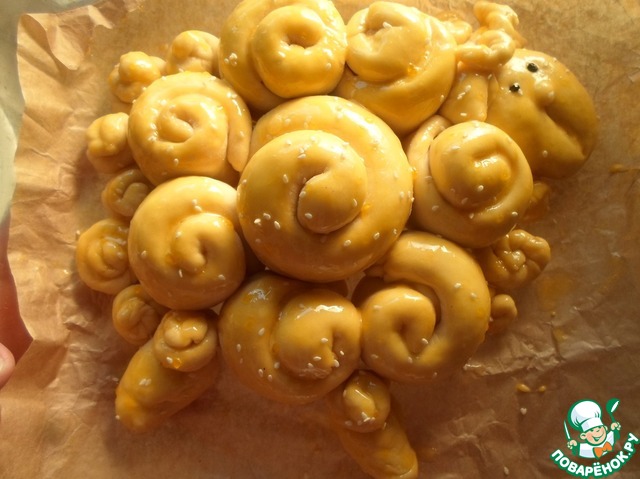 • Смазываем взбитым желтком. Отправляем выпекаться, при температуре 180 градусов, на 30-40 минут до зарумянивания поверхности.
