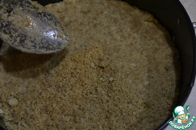Выкладываем крошку в разъемную форму и плотно утрамбовываем. Убираем в холодильник минут на 30-40.