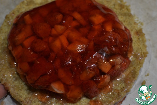Ставим бортики и поверх желе выкладываем творожный крем, заполняя промежуток между желе и бортиком. Убираем в холодильник минимум на 6 часов (у меня стоял ночь). В принципе, наш торт готов, далее украшаем по своему вкусу.