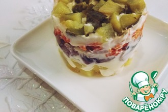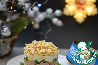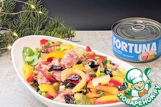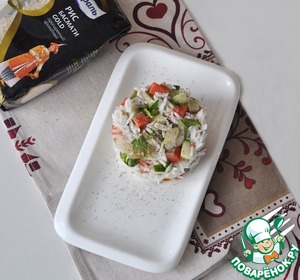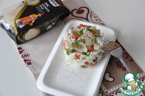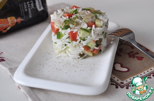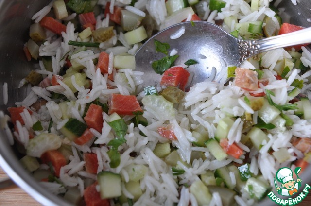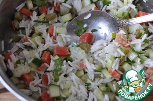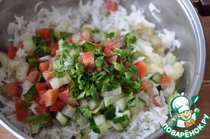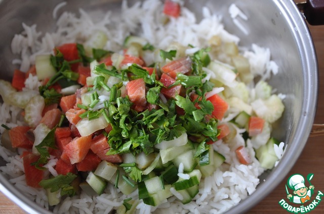 Смешать овощи и рыбу с остывшим рисом. Заправить салат мелкорубленной зеленью петрушки, соком лимона, оливковым маслом. Перемешать. Подавать охлаждённым, посыпав свежемолотой смесью перцев.