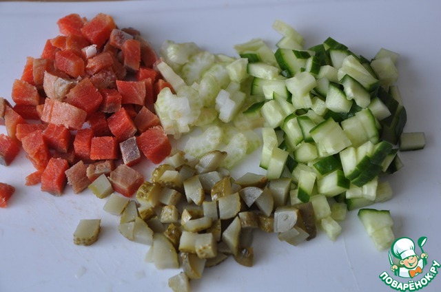 Мелкими кубиками нарезать малосольный лосось, маринованные и свежие огурцы, черешковый сельдерей.