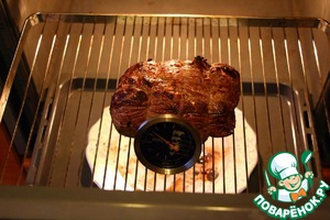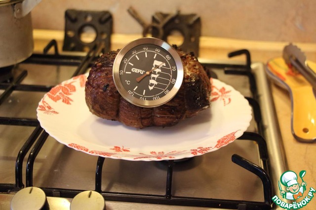 Запечатали? Не обожглись? Тогда втыкаем в кусок градусник, так что-бы конец щупа оказался в середине куска. По нему будем следить за "состоянием здоровья" мяса. У кого его нет, даже не знаю что посоветовать... Купить, наверное, незаменимая штука для запекания мяса и, даже, для шашлыков на природе.