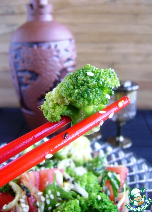 Это мой любимый праздничный салат. Попробовала я его в Маньчжурии десять лет назад и влюбилась практически сразу. С тех пор стараюсь готовить как можно чаще. Его очень хорошо подавать на праздничный стол - он малокалориен и его можно спокойно лопать в течение всего вечера, не подвергая себя угрызениям совести. Сплошная польза и наслаждение вкусом. Если у вас брокколи своя, то можно и не бланшировать ее кипятком, а класть в салат сырой.
