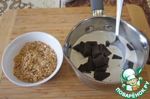 Орехи и печенье поместить в чашу блендера, измельчить. В сливки добавить поломанный на кусочки шоколад.
