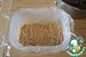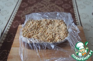 Пищевую пленку смазать маслом и выстелить ею прямоугольную форму. Выложить половину ореховой смеси, разровнять и немного уплотнить.