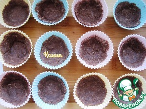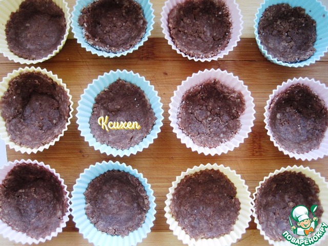 Тесто достаём из холодильника, освобождаем от плёнки, отщипываем небольшие кусочки теста. Распределяем тесто в формочках таким образом, что бы образовались небольшие бортики. Тесто по прежнему рассыпается, поэтому формируем корзиночки, как бы вдавливая тесто в формочки. Духовку включаем на разогрев, t 180 градусов, а формочки с сырыми заготовками убираем в холодильник на 20-ть минут.