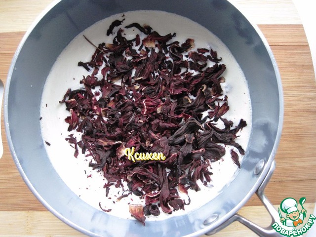 Снимем сливки с огня, добавим каркаде, перемешаем, закроем сотейник крышкой и оставим на 2 часа настаиваться.
