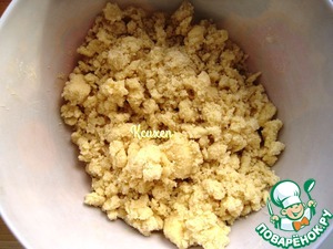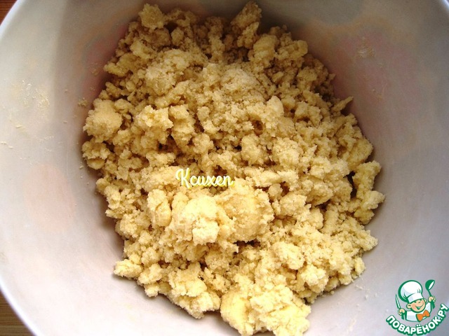 На доске расстилаем пищевую плёнку, высыпаем песочную крошку и, легонько сжимая, заворачиваем тесто в плёнку, формируя не толстую лепёшку. В тесте заметны вкрапления малюсеньких кусочков сливочного масла. Убираем тесто на 1 час в холодильник.