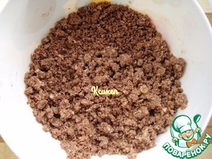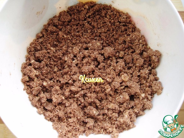 Добавим к масляно-мучной смеси сахарную пудру и какао-порошок, перемешаем, не прессуя тесто. Тесто по прежнему должно оставаться крошкой, но уже шоколадной.