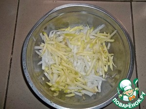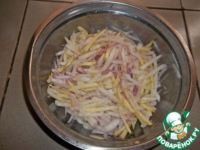 • Лук нарезать тонкими четвертинками колец. Добавить 3ст. л. лимонного сока и сахар. Перемешать прямо рукой. Лимонный сок и сахар смягчат резкость лука и раскроют вкус дайкона. Убрать пока в холодильник.