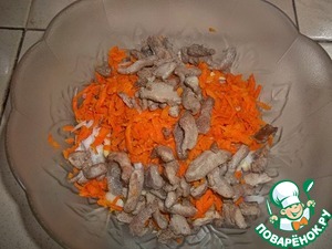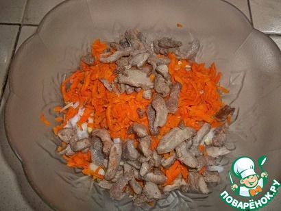 • Морковь натереть на терке и обжарить с 1 ст. л. масла, подсолив. Мясо так же обжарить на сильном огне, выложить на салфетку, чтобы избавиться от излишков жира. Достать овощи из холодильника, слегка отжать ( не сильно!!!, просто убрать лишний сок). Выложить в салатник, добавить морковь и мясо. Для заправки тщательно смешать все ингредиенты и заправить салат. Если нужно, скорректировать специи, я ничего больше не добавляла. Дать салату настояться на холоде минимум 30 минут, а чем дольше, тем лучше.