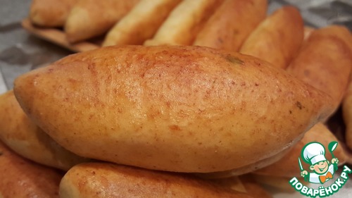 Получаем вытянутые лодочки. Кладём пирожки швом вниз на противень, застеленный пекарской бумагой. -