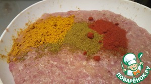 Проворачиваем в мясорубке филе бедра индейки, репчатый лук и чеснок. Добавляем по 1 ст. л. хмели-сунели, паприку, куркуму и соль. Тщательно вымешиваем фарш.