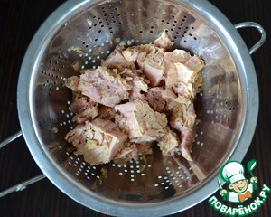 Консервированного тунца в масле выложить в дуршлаг и дать стечь маслу.
