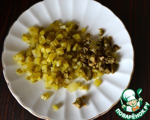 Отдельно нарезать помельче маринованные огурчики и каперсы.