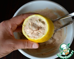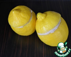 Подготовить лимоны. Как следует их вымыть, срезать с одной стороны верхушку и ножом (ложкой) осторожно удалить всю мякоть из лимона, стараясь не повредить внутри кожуру.