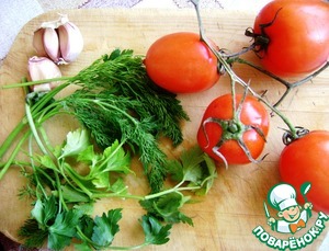 Помидоры и зелень вымыть и хорошо просушить. Чеснок очистить и нарезать брусочками.