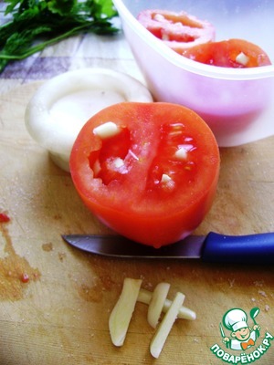 У помидор срезать крышечки и нашпиговать их брусочками чеснока, предварительно слегка обмакнув их в мелкую соль.