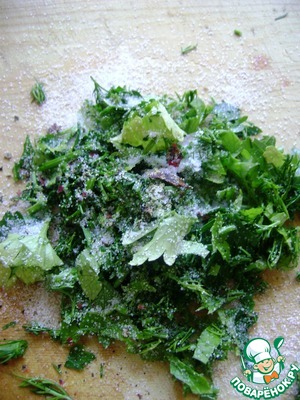 Уложить в неокисляемую посуду с крышкой и посыпать остатками соленой зелени. Накрыть крышкой и дать постоять на столе 3-4 часа. Затем убрать в холодильник на ночь.