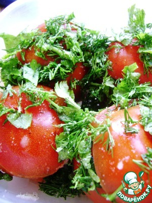 Укроп и петрушку мелко нашинковать. Присолить, посыпать по вкусу перцем, слегка перемешать и немного нафаршировать зеленью помидоры.