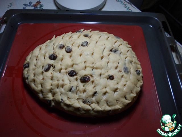 Замесить тесто из всех ингредиентов, кроме изюма. Изюм ввести в уже готовое тесто и хорошо вмесить в тесто.