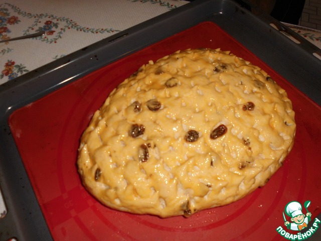 • Замесить тесто из всех ингредиентов, кроме изюма. Изюм ввести в уже готовое тесто и хорошо вмесить в тесто.