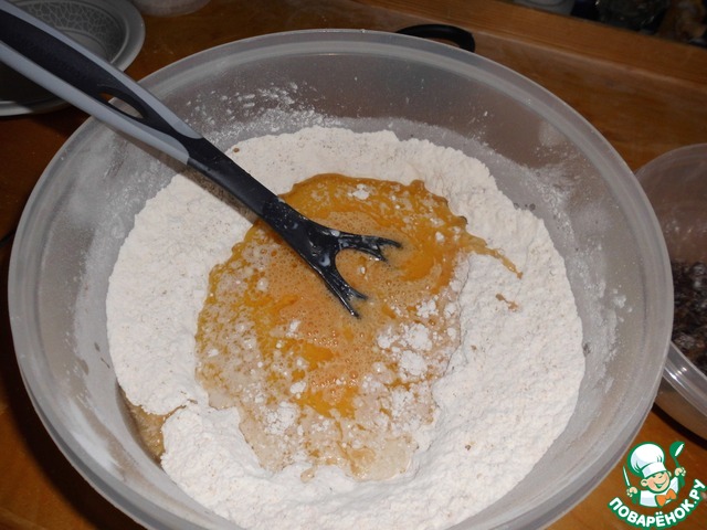 Дрожжевую массу влить в углубление, сделанное в муке.