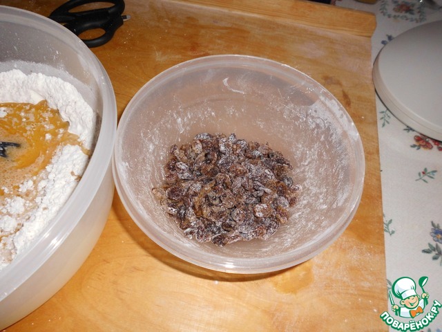 Изюм помыть, обсушить бумажным полотенцем и припылить мукой, чтобы лучше распределился в тесте.