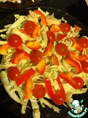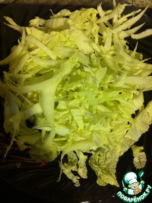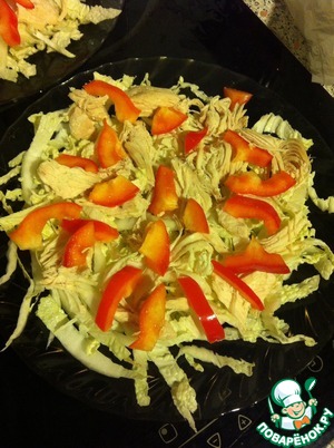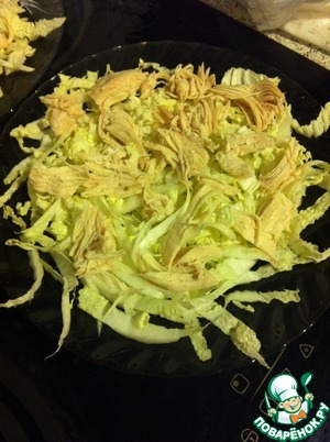 Заранее отвариваем куриную грудку. Берем 3 плоские тарелки ( будет три большие порции), нарезаем капусту, я нарезаю ее поперек. Выкладываем слой.