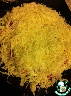 Нарезаем небольшими брусочками болгарский перец ( обычно у меня уходит 2/3 перца) и выкладываем равномерно.