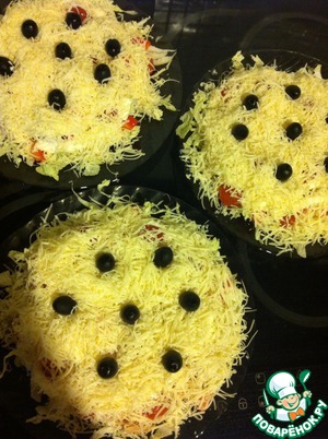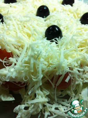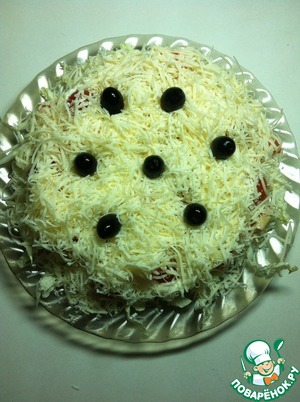 Маслинами украшаем наш салат, оставшиеся ставлю на стол и мы едим их в прикуску)) Вместо маслин можно украсить белыми сухариками, а маслины добавить внуть как слой, но мы часто готовим без них, так как и так вкусно, ну и сухарики лень сушить))