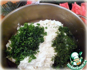 Добавить мелко порезанные укроп, зеленый лук, перемешать.