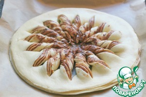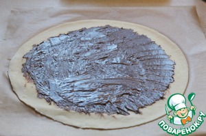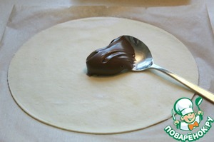 Укладываем первый круг на пергамент и выкладываем на тесто 1 ст л шоколадной пасты с горкой.