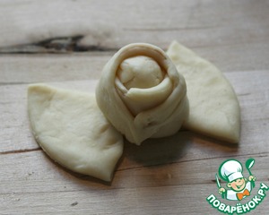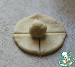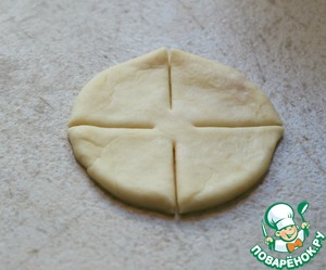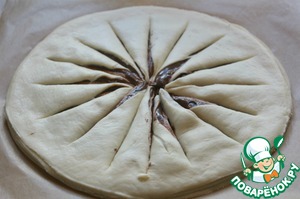 Раскатываем небольшой круг и надрезаем его не доходя до середины. -