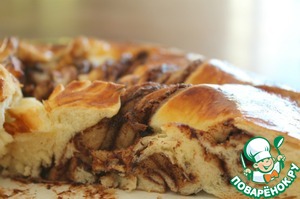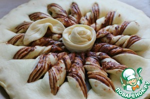 Смазываем желтком белые части пирога. Оставляем на расстойку в теплом месте на 20 минут и отправляем в разогретую до 180 духовку на 25-30 минут.