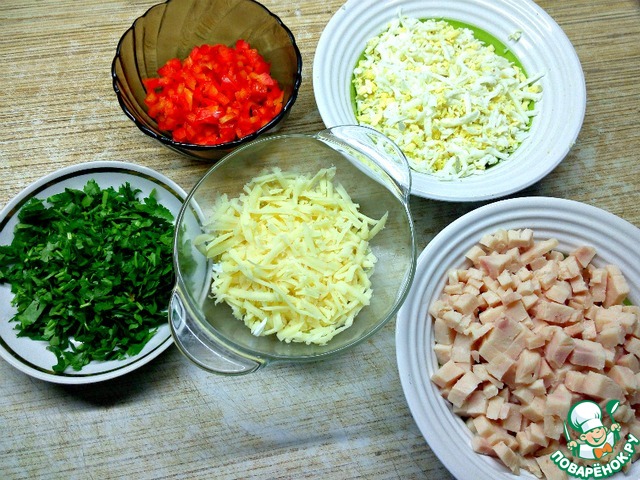 • Подготовить продукты. Яйца отварить, очистить и натереть на терке. Сыр так же натереть на терке. Ветчину и болгарский перец нарезать мелким кубиком. Зелень вымыть, стряхнуть воду и мелко нарезать.