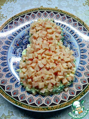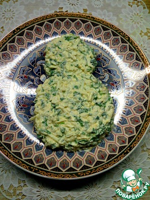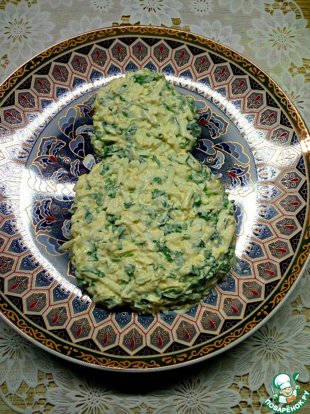 • Собираем салат. Яйца смешать с зеленью и майонезом, посолить по вкусу. Выложить первый слой. Я выкладывала в виде восьмерки.