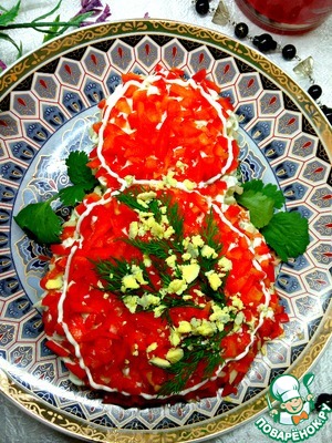 • Последний слой болгарский перец. Украшаем и оставляем в холодильнике немного настояться и охладиться. Приятного аппетита!