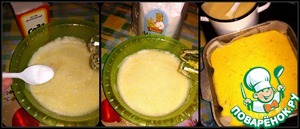 Как и писала в рецепте - тесто выливается в форму СРАЗУ, в один прием, через 10 мин сверху выливаем крем. И-то, как крем ведет себя в выпечке это видно на фото - происходит расслоение на "тесто-крем-крем+тесто". Как я понимаю это от того, что тесто тяжелее крема
