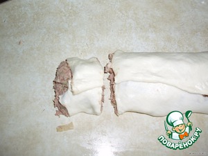 Из теста делаем жгутик и раскатываем его в виде прямоугольника. Выкладываем начинку.
