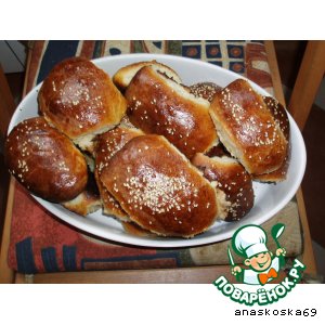 Выкладываем в смазанную сковородку и мажем верх яйцом и обсыпаем кунжутным семенем.