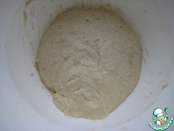 Добавить к жидкой части муку, растительное масло и вымесить хорошо тесто. Тесто получается мягкое, оставить его на подъем на 2 часа, прикрыв емкость пищевой пленкой.