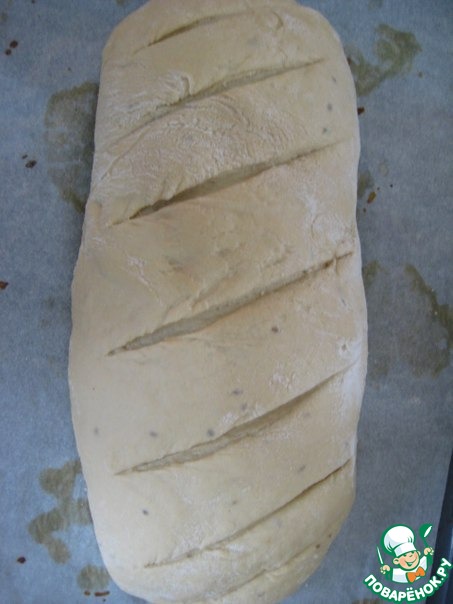 Тесто обмять, выложить на присыпанный мукой стол, сформировать батон, уложить на противень, на котором будете выпекать, накрыть полотенцем, оставить на 1,5 часа до увеличения объема вдвое. На батоне сделать надрезы.