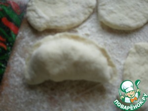 Берём кружочек в левую руку, сыплем немного сахара, три вишенки и щепотку крахмала. крахмал впитает лишнюю влагу. Защипываем. Вот такие примерно красавчики должны получится.