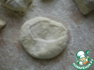 Катаем скалкой. И так все 15 кусочков. Кружочки достаточно большие, ведь нам нужно ещё туда запихнуть по 3 вишенки.