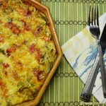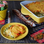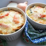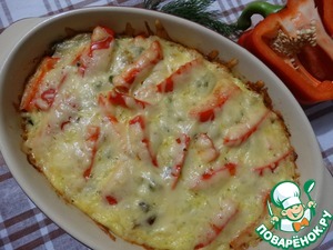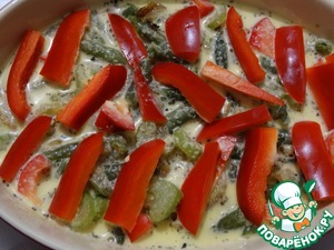 Выложить овощи в форму. Залить заливкой, сверху разложить кусочки красного болгарского перца и посыпать тертым сыром.