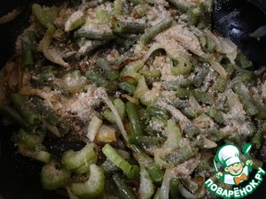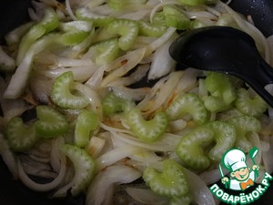 Лук очистим и нарежем крупными полукольцами, обжарим 5 минут на сковороде в растительном масле. Добавим к луку нарезанный стебель сельдерея, не забыв все посолить, обжарим все вместе еще 3-5 минут.
