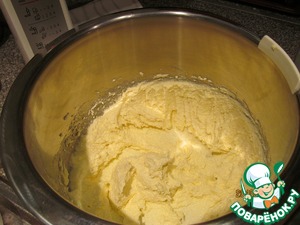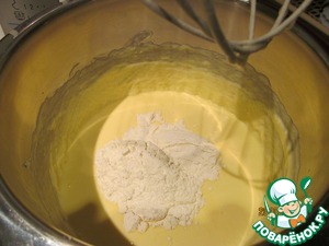 Муку просеять, смешать с разрыхлителем и постепенно добавить в пышную масляно-яичную пену.